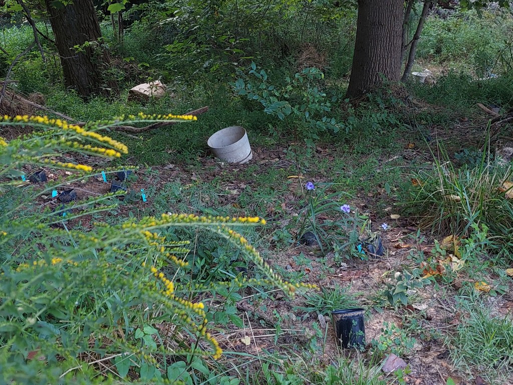 In a burst of pinning hopes on one simple solution, I got five or six of these bright yellow coreopsis plants. They’re nice, but they only bloom it turns out for like 2 weeks, in the fall. I planted them in the shadowy spot, too, maybe that was a mistake. While the flowers only last 2 weeks, the leafy stalks start growing in the spring. So they will suppress weeds. But they don’t really spread out that much. They sort of stay rigidly in their little circle. No sprawling like the spiderwort. I think that one of the five plants has died since I first planted it. It might have been my fault, it sort of got planted in a hollow where an invasive privet tree once stood.