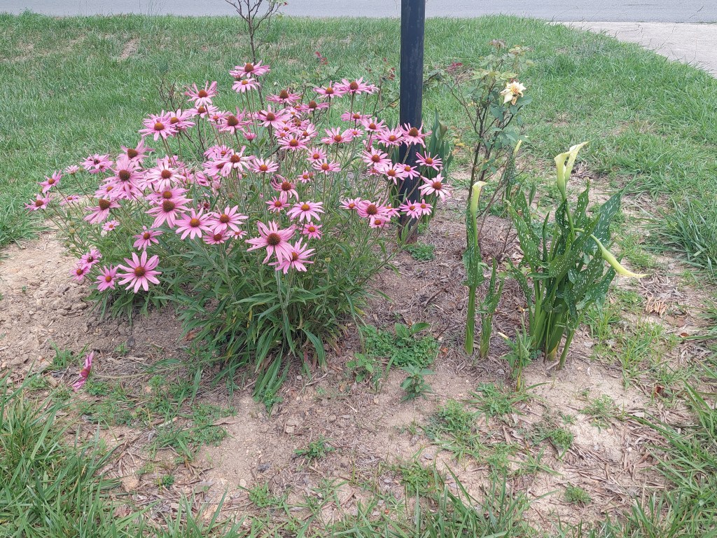 These are very easy to plant, and they don’t need a lot of care. They will also take up quite a good bit of space and suppress weeds. They don’t start blooming until maybe end of July or August. The ones in the picture here look nice, but that’s not from our house. The ones I planted at our house maybe look more straggly. I don’t know.