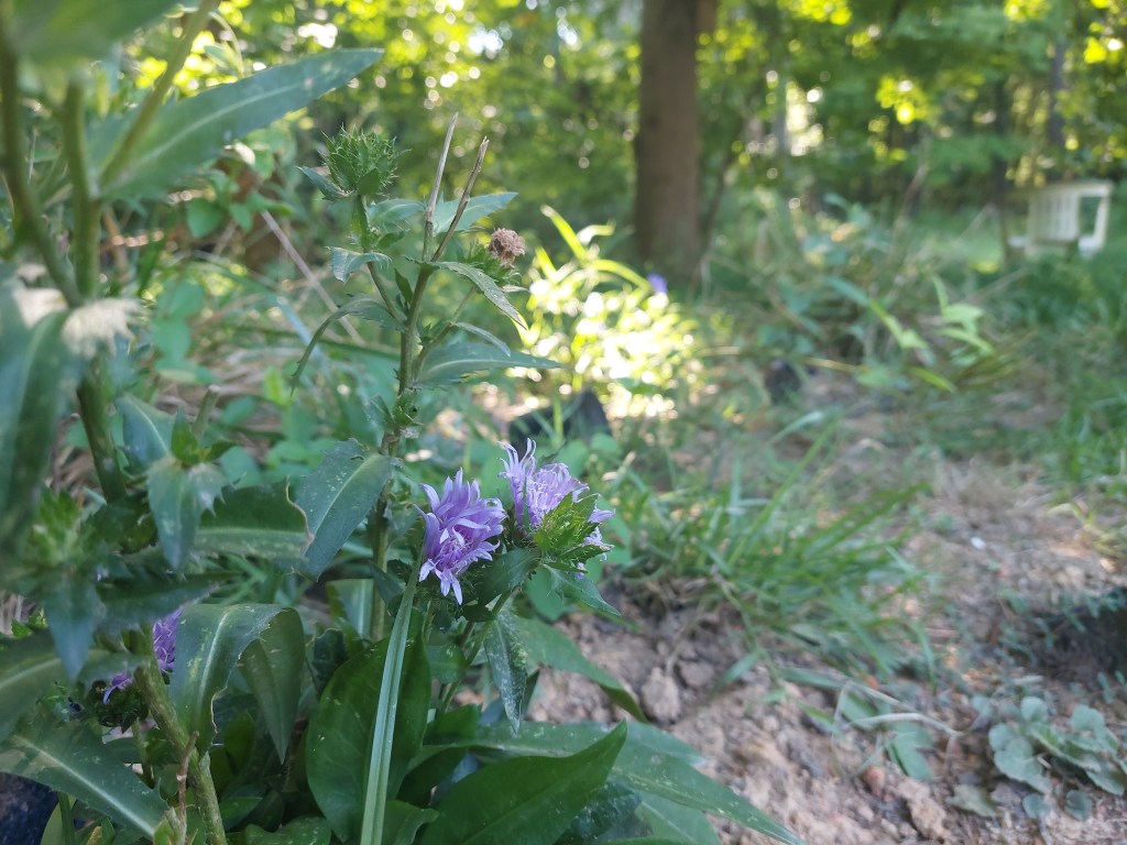 These are some of my favorites. They will stretch themselves out over a large patch of bare earth, suppressing weeds. They are so pretty. And they have so many blooms. And they bloom from like April or May to mid-summer! That’s a nice long time. I got two of them, and they’re both still alive, and both still in the same shadowy spot I originally planted them. Like big wet purple child’s eyes when they open after sleep.