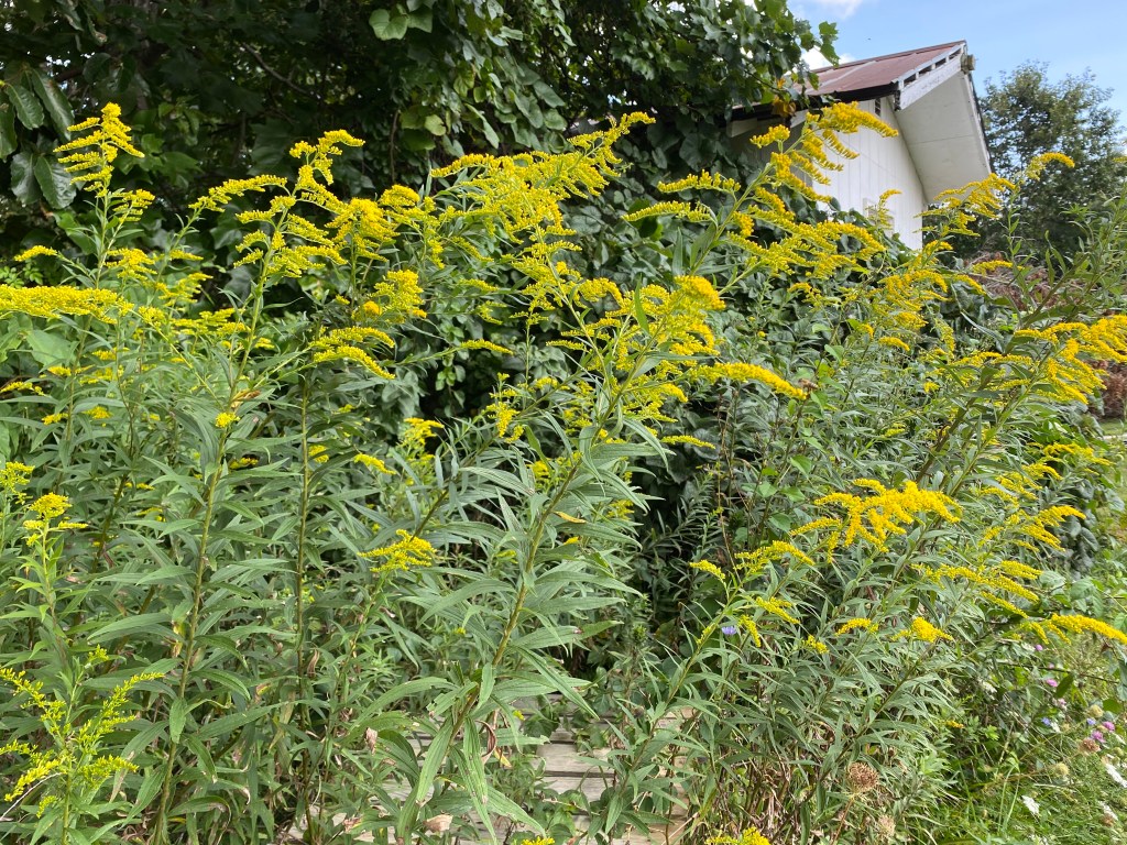 I really like these beautiful yellow flowers! It takes up a lot of space — so excellent for suppressing weeds. I’m writing this just before the Fourth of July, and it is full of buds, and little yellow tendrils are starting to poke out! So beautiful. When I first planted this, I sort of ached for it, because it was under the trees and I saw it reaching and reaching for the sun, and straining to push out a bud and let it bloom. So after the summer was over, I dug a giant new hole that would be closer to the sun-line; and then I dug and dug around and under the plant till I was able to excavate it. I dug a lot so as not to tear any of its roots, and it took a long time because its roots were already well-entrenched. It survived the move, and from then on has been giving out an abundance of beautiful yellow flowers.