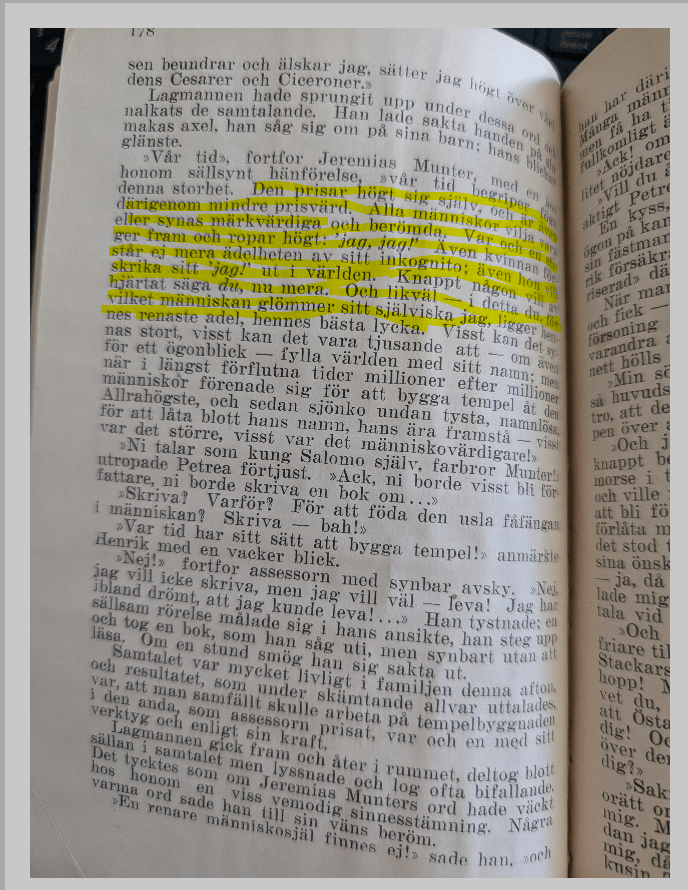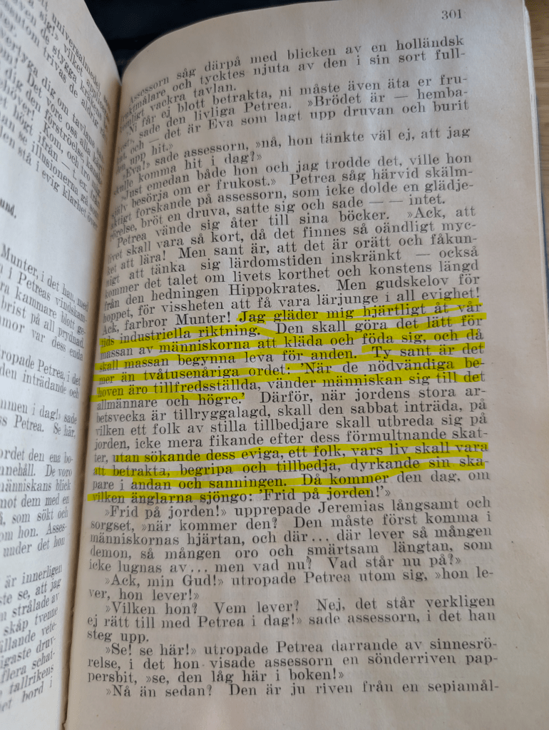 Then there was one third thing that stuck out to me, except it wasn’t because it felt true to today, it was because of how wrong this prediction was. The character Petrea says: “Oh, I am so sincerely glad about our time’s industrial direction. It’s going to make it easy for the masses to clothe and feed themselves, and then, the masses will start to live for their souls. Because these ancient words are true: ‘When the necessary needs are satisfied, a person can then turn towards the higher…. Searching after the eternal, a people whose lives it will be to (go towards) the soul and truth. And then the day will come when the angels will sing ‘Peace on Earth!'”