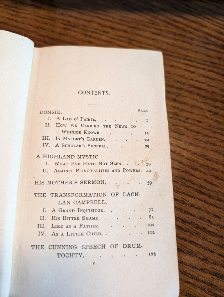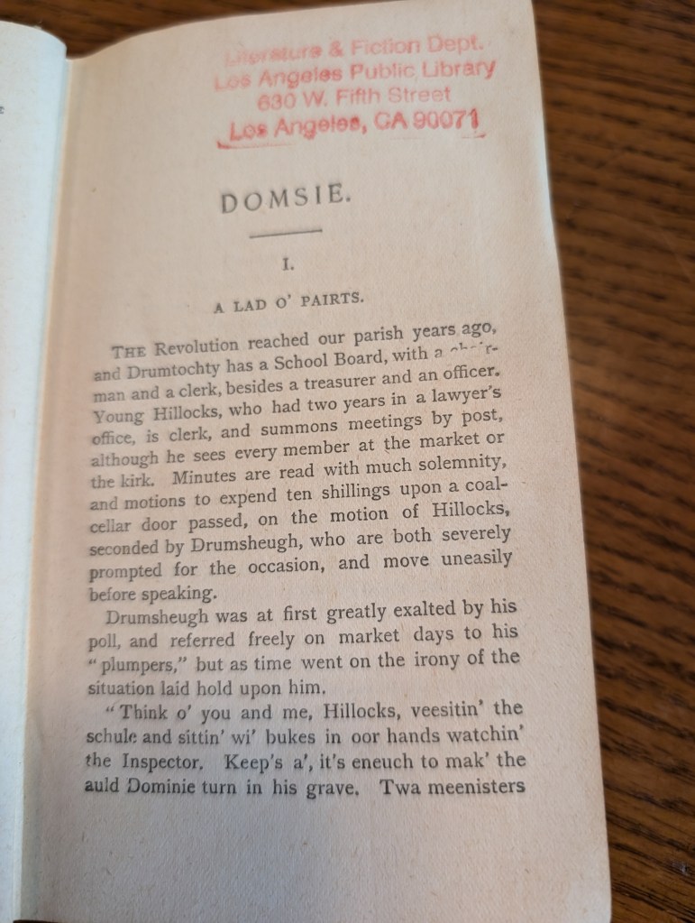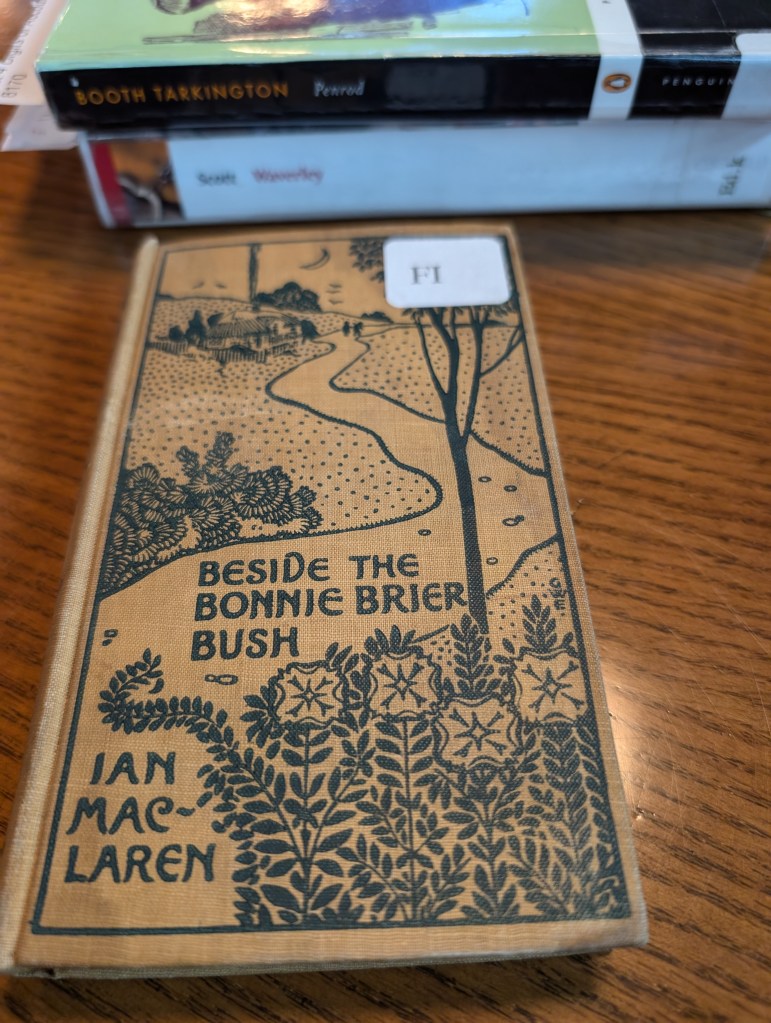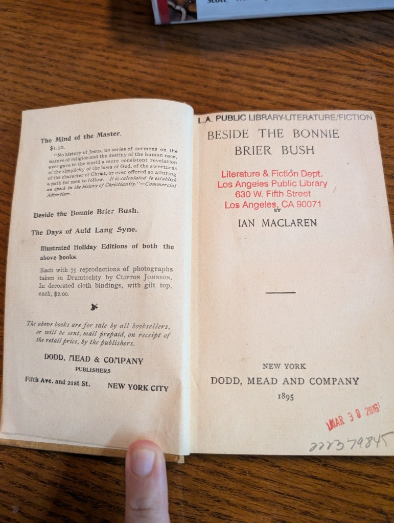 So I sat down at a table and did just that, and it was soon obvious why we can’t leave the library with Beside the Bonnie Brier Bush. I think it’s because the book I had in my hands was an actual copy from 1895. I studied the publication page carefully and there was no mention of it being a recent reprint. Just “1895” and the telltale feel of an old, fragile, and threadbare book.