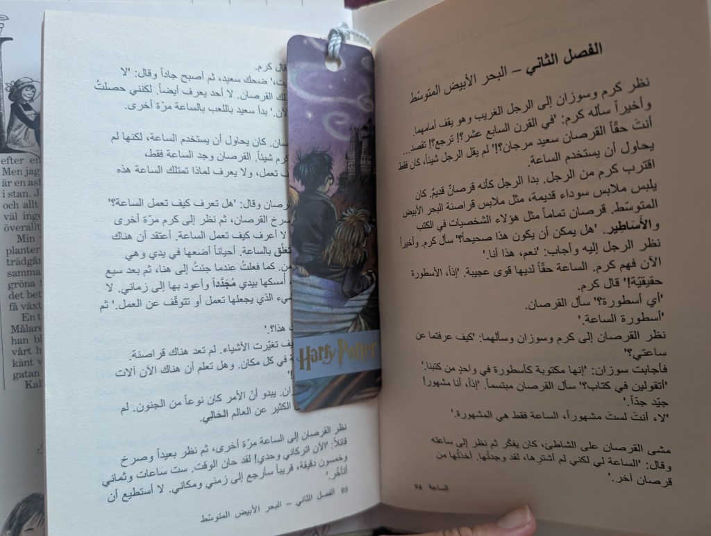 I’ve gotten much better at reading both Arabic and Swedish … Arabic after having read the translated versions of the first three Harry Potter books, and Swedish after having read a few old, thick, word-rich Swedish books I found at the Los Angeles Library.