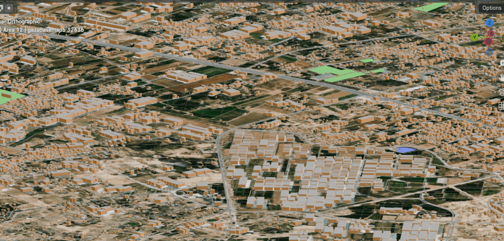 In QGIS, I also have the data from UNOSAT about all the buildings in Gaza that have been destroyed (the red ones, so practically all of them). I created a grid of that data, and my next step is apply that grid to the buildings in Blender. In that way, it will be a 3D visual of what’s been destroyed there.