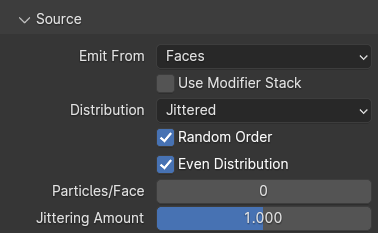 Actually, I don’t now remember if all that is the default, or I had to change the “emit from” for another particle system.