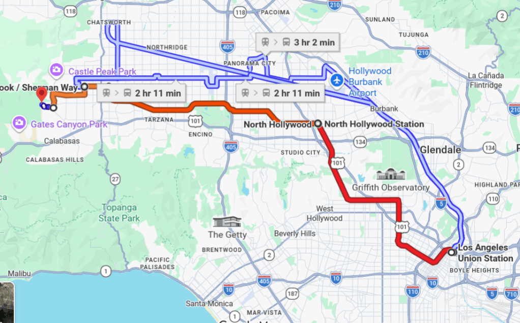 But for me, from Union Station, I took the red metro line to the North Hollywood Station. I know! The Red Line is possibly the most psychotic of all of them, and that’s saying something in a city where all the metro lines rival each other for the most distinct and exalted state of psychosis. Well, I got off in North Hollywood Station, and man! That place is a DUMP. Holy cow. Like, really be careful because you might get killed. I think people have been killed there … but you can say the same for most of the metro stations, probably. Well, from North Hollywood Station, you’re going to take the Orange line bus. Yikes, that bus sucked too. You know, that bus usually has a special lane, I think, that lets it go fast. But when I did it, that special lane was under construction. So instead, we were stuck with all the traffic.